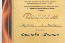 18-19 февраля на базе МБУДО "ДМШ№5" г.Казани состоялся Международный конкурс-фестиваль "Fortissimo" . Фролова Милана (пр.Шакирова Е.Н., конц.Кошкин А.А) - Лауреат I степени.Поздравляем!!!