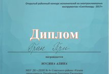 25 февраля 2017 года на базе МБУ ДО "ДМШ №19" Советского района г.Казани состоялся <span times="" new="" ',="" times,="" "="" style="outline: 0px">Четвертый Городской конкурс исполнителей на электроклавишных инструментах «СинтАккорд». Яркое выступление Мусиной Алины (пр.Никифорова Е.Е.) в номинации «Сочинение для клавишного синтезатора» вторая возрастная категория (10-12 лет) – Диплом ГРАН-ПРИ! Поздравляем!!!