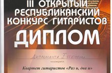25-26 февраля в МБУДО "ДШИ №6" г.Казани проходил Рспубликанский конкурс гитаристов. Квартет гитаристов "Раз и, два и" (пр.Тадовская О.В.) - Дипломант I степени, Нагорских Даниил (пр.Абдуллин Б.Р.) - Дипломант II степени.