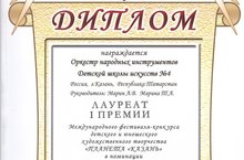 24 февраля в Татарском государственном театре кукол "Экият" состоялся Международный фестиваль-конкурс "Планета"Казань" .Оркестр народных инструментов (рук.Марин А.В., Марина Т.А.) - Лауреат I степени, Ансамбль блокфлейтистов (рук.Шевелева И.В., конц.Кошкин А.А.) - Дипломант III степени. Поздравляем!!!