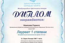 с 10 - 11 декабря проходил Международный фестиваль-конкурс "Хрустальное сердце мира". Белов Илья (пр.Горшенина Н.Г.) - Лауреат I степени, Мамяшева Радмила (пр.Карпова О.А., конө.Хамидов Р.Р.) - Лауреат I степени, Фортепианный дуэт: Ахмерова Алина, Шамаева Дарья (пр.Гайдукова В.В.) - Лауреат III степени, Квинтет "Чиполлино" (пр.Карпова О.А., Арнольдова И.Р., Рафикова Д.А.) - Лауреат 1 степени, Хуснутдинова Адиля - Лауреат II степени и Сабирзянова Карина (пр.Горшенина Н.Г.) - Лауреат III степени.