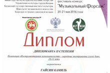 20-21 мая 2016г. состоялся международный детско-юношеский фестиваль-конкурс «МУЗЫКАЛЬНЫЙ ФОРСАЖ» на базе Казанского государственного института культуры. Гайсин Камиль (пр.Марина Т.А.) - Дипломант 2 степени, Стальмахова Анна(пр.Марина Т.А.) - Лауреат 3 степени. Поздравляем!!!