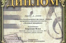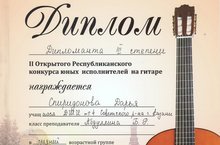 В Казани состоялся II Открытый Республиканский конкурс юных исполнителей на гитаре. За звание лучшего соревновались 14 ансамблей и более 70 солистов школ Казани и Татарстана. После проведения конкурсных прослушиваний жюри определило 31-го лауреата конкурса. Поздравляем учащихся нашей школы Валиуллова Тимура (пр.Тадовская О.В.) - Дипиломант III степени, Спиридонову Дарью (пр.Абдуллин Б.Р.) - Дипломант III степени, Ансамбль гитаристов (пр.Моисеева Е.А.) - Дипломант III степени, Ансамбль гитаристов (пр.Абдуллин Б.Р.) - Дипломант II степени