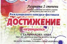 Поздравляем участницу Международного конкурса-фестиваля "Достижение" -Стальмахову Анну (пр.Марина Т.А.)- Лауреат II степени.