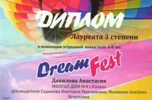 9-12 января 2016г. г.Казань во "Дворце культуры Химиков" проходил Международный конкурс-фестиваль " Dreamfest" . Организаторы фестиваля: Творческое фестивальное движение «Наше время»при поддержке Международного Центра Современной Хореографии International Dance Center (IDC) г.Санкт –Петербург. Поздравляем Лауреатов: Гимадеев МАрсель (пр.Маликова А.Я., конц. Никифорова Е.Е.) - Лауреат I степени в номинации академический вокал, - Дипломант I степени в номинации эстрадный вокал. Данилова Настя (пр.Маликова А.Я.) - Лауреат III степени.