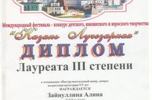 Поздравляем с успешным выступлением на Международном фестивале-конкурсе детского, юношеского и взрослого творчества "Казань Лучезарная" Зайнуллину Алину (пр.Зайцева К.Л.) - Лауреат II степени в номинации инструментальный жанр соло!