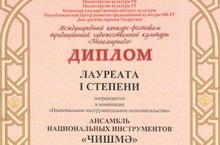 Поздравляем лауреатов Международного конкурса-фестиваля традиционной художественной культуры "Этномириада": Ансамбль "Чишмэ"(рук.Гарифзянов С.З.) -Лауреат I степени, Дуэт кураистов Мухутдинов Эмир, Шавалеев Амир (рук.Гарифзянов С.З.)- Лауреат II степени, Трио кураистов Гарифзянова Райхан, Минулина Регина, Ситдикова Гузалия (рук.Гарифзянов С.З.) - Лауреат III степени; Дуэт Галауетдинова Инзиля, Гатауллина Инзиля (рук.Хуснуллина А.И., конц. Ларин О.Ф.) - Дипломант I степени; Усов Денис (балалайка) -(рук.Усов А.А.,Конц. Хамидов Р.Р.) - Лауреат II степени;.Нелюбин Максим (рук.Усов А.А., рук.Хамидов Р.Р.) - Лауреат I степени; Мисбахов Кирилл (рук.Усов А.А., конц.Хамидов Р.Р.)-Лауреат III степени;Хакимова Зиля (рук.Гилязова М.Н.) - Лауреат III степени, Романов Никита (рук.Гилязова М.Н.) - Дипломант фестиваля