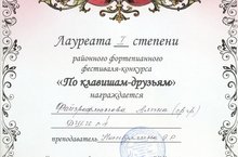 Файзрахманова Алина (преподаватель Насыбуллина Э.Р.) Лауреат I степени районного фортепианного фестиваля-конкурса "По клавишам друзьям". Тельгерова Анастасия (преподаватель Гайдукова В.В.) Лауреат II степени. Поздравляем!!!