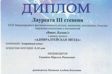 Поздравляем Гимадеева Марселя (преподаватель Маликова А.Я.) ставшего Лауреатом III степени Международного фестиваля-конкурса детских, юношеских, молодежных, взрослых творческих коллективов и исполнителей "Виват, Казань!" в рамках проекта "Адмиралтейская звезда" в номинации эстрадный вокал 8-10 лет.