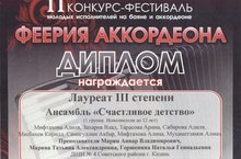21-22 февраля в Концертном зале Казанского музыкального колледжа им.И.В.Аухадеева состоялся II Международный конкурс -фестиваль молодых исполниьтелей на баяне и аккордеоне "Феерия аккордеона". Ансамбль народных инструментов "Счастливое детство" (руководители Заслуженный артист РТ Марин А.В. и Марина Т.А.)и юная вокалистка Фатьянова Александра (руководитель Горшенина Н.Г.) стали Лауреатами III степени. Поздравляем!!!