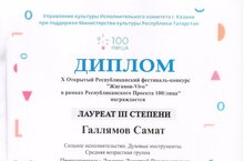 25 января в ДМШ № 14 состоялся X Юбилейный конкурс-фестиваль «Жиганов-Vivo», в котором принял участие Галлямов Самат (кларнет,преп. Домнин Д. В.) Фестиваль прошёл в торжественной обстановке, и участники продемонстрировали высокий уровень исполнительского мастерства, а также глубину и богатство творчества Назиба Жиганова. Выступления участников оценивало высококвалифицированное жюри.Поздравляем Самата с присвоением звания Лауреата 3 степени на этом конкурсе и желаем ему дальнейших творческих успехов!