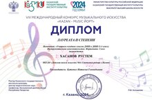 20 апреля в КМЦ им. Гайдара г. Казань прошёл Международный конкурс – фестиваль инструментального искусства «Поколение-2024». Никандров Ярослав, класс преподавателя Галиева И.Ф., принял участие в конкурсе, как солист в номинации инструментальное исполнительство (народные инструменты). Показал хороший результат и стал Лауреатом 3 степени. Желаем дальнейших успехов и новых побед!!!