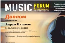 15 сентября состоялся Международный конкурс искусств «MUSIC FORUM» Гаязутдинова София (преп. Насыбуллина Э.Р.) стала Лауреатом 2 степени. Поздравляем!!!