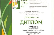 Хореографический коллектив «Мастерская детства» (руководители Сладкова К.В., Яшина К.С., постановщик Ермолаев А.О.) приняли участие в XIV Поволжском конкурсе эстрадного мастерства детских и юношеских творческих коллективов «TATARSTAN.RU» завоевав ГРАН-ПРИ конкурса и стали Лауреатами I степени в разных номинациях. Поздравляем!