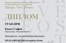 Поздравляем обладателя Диплома ГРАН-ПРИ Международного конкурса виртуозного исполнительского мастерства «Allegro.Vivo.Presto» - Косач Софию (преподаватель Козлова В.В.) !!!