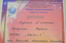 Сегодня в ДМШ №19 состоялся Первый городской конкурс "Звуки мира". Хуснуллин Марсель (пр.Данилова А.А, конц.Сабелькин М.А) - Лауреат 3 степени, Хасбиуллина Мадина (пр.Волкова Н.А., конц.Казакбаева Л) - Лауреат 3 степени, Гарифуллина Риана - Дипломант. Поздравляем!!!