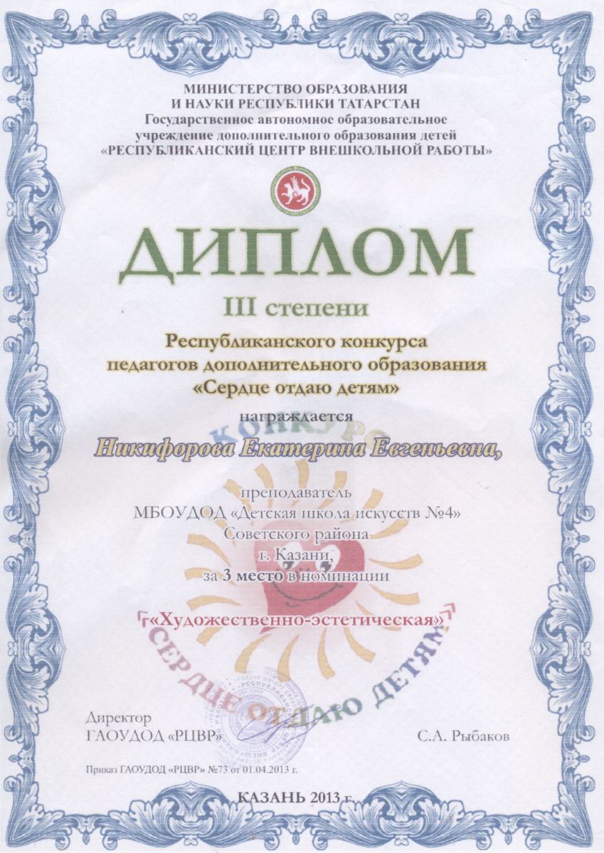 Республиканский конкурс "Сердце отдаю детям" Никифорова Е.Е. диплом IIIстепени