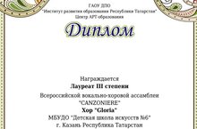 В феврале ГАОУ ДПО «Институт развития образования Республики Татарстан» и Центр АРТ-образования провел Всероссийскую вокально-хоровую ассамблею «Canzoniere» («Книга песен»). В номинации «Хоровое пение» хор «GLORIA» ДШИ № 6 стал лауреатом III степени.