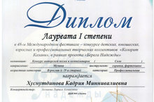 Поздравляем Хуснутдинову К.М. со званием Лауреата I степени в номинации "Конкурс авторской песни и композиторов", Жаркова Дана класс преподавателя Шайхиевой Х.А. со званием Лауреат III степени в номинации "Инструментальное исполнительство (фортепиано) - соло", дуэт Верниковская Суламита и Зигангараева Алина класс преподавателя Ахмаевой Л.А. со званием Лауреат III степени в номинации "Инструментальное исполнительство (фортепиано) - дуэт".