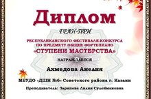 Ахмедова Анелия, обучающаяся класса преподавателя Зариповой Лилии Сулеймановны, удостоена звания ГРАН ПРИ Республиканского фестиваля-конкурса по предмету Общее Фортепиано «Ступени Мастерства» (класс преподавателя Зарипова Лилия Сулеймановна)!