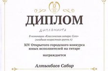 Поздравляем Алтынбаева Сабира (рук. Абдуллин Б.Р.) с результативным участием в Открытом Городском конкурсе юных исполнителей на гитаре!