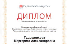 Педагог нашей школы Гудошникова Маргарита Александровна приняла результативное участие во Всероссийской олимпиаде "Педагогический успех". По итогам конкурса получила диплом за 1 место в номинации "Портфолио, как средство оценки профессионализма педагога". Поздравляем! Желаем дальнейших творческих успехов!
