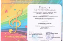 Учащиеся нашей школы приняли участие в Республиканском конкурсе творческих работ "Музыкальная палитра, посвященный 110- летию со дня рождения В.П. Соловьева -Седого. По итогам конкурса Мухамеев Марсель (рук. Усенкова Е.С.) получил Грамоту "За творческий подход в номинации "Музыкальная акварель". Поздравляем! Желаем дальнейших творческих успехов!