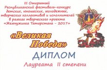 Учащаяся нашей школы Закирова Эльза (рук. Пономарёва М.Ф.) принимала участие в III Открытом Республиканском фестивале-конкурсе детских, юношеских, молодежных творческих коллективов и исполнителей в рамках творческого проекта "Жемчужинка Татарстана - 2017" "Великая победа". По итогам конкурса получила диплом лауреата 2 степени в номинации "Год экологии в России и в Татарстане". Поздравляем! Желаем дальнейших творческих успехов!