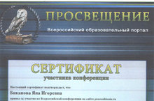 Учащаяся 6 класса Биканова Яна приняла участие во Всероссийской конференции на сайте prosveshhenie.ru, получив сертификатучастника. Педагог Сайфутдинова Н.С., подготовившая участника, получила сертификат за подготовку к участию!
