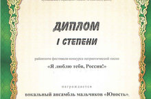 Вокальный ансамбль мальчиков "Юность" (педагог Кожинова Т.А., концерт. Шарафиева Е.Л.) приняли участие в районном фестивале - конкурсе патриотической песни "Я люблю тебя, Россия!" По итогам конкурса получили диплом 1 степени. Поздравляем, желаем дальнейших творческих успехов!