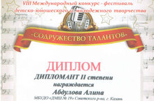 Диплом лауреата 2 степени - Мифтахов Амирхан (педагог Пономарёва М.Ф.)