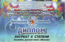 Поздравляем ансамбль русской песни "Махоня" (руководитель: Руднева Анастасия Витальевна) - Лауреата II степени Международного фестиваля- конкурса детского и юношеского творчества "Весенняя капель"! Желаем дальнейших творческих успехов и новых побед!
