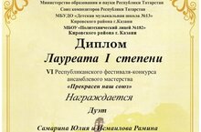 Поздравляем дуэт: Самарину Юлию, Исмаилову Рамину (преподаватель: Клименко Ольга Вячеславовна) - Лауреата I степени VI Республиканского фестиваля-конкурса ансамблевого мастерства "Прекрасен наш союз"! Желаем дальнейших творческих успехов и новых побед!