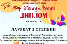 Лауреат II степени - ансамбль русской песни "Махоня", ансамбль струнных народных инструментов "Балагуры", руководители: Руднева А.В., Аксакова-Хусаенова А.В., Васильева Е.В., концертмейстер: Бадрутдинов Р.М.