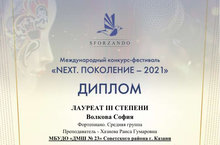 Поздравляем Волкову Софию (преподаватель: Хазиева Р.Г.) - Лауреата III степени Международного конкурса-фестиваля "NEXT. ПОКОЛЕНИЕ - 2021"! Желаем дальнейших творческих успехов и новых побед!
