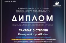 Поздравляем камерный хор "Gloria" (руководитель: Уварова Л.Р., концертмейстер: Асадуллина О.А.) - Лауреата III степени Международного фестиваля-конкурса искусств "Отражение"! Желаем дальнейших творческих успехов и новых побед!