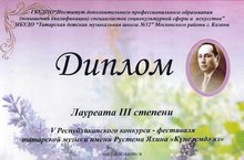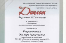 Бадрутдинова Э.М. - Диплом лауреата 3 степени в номинации "Программы" (инструментальное исполнительство)
