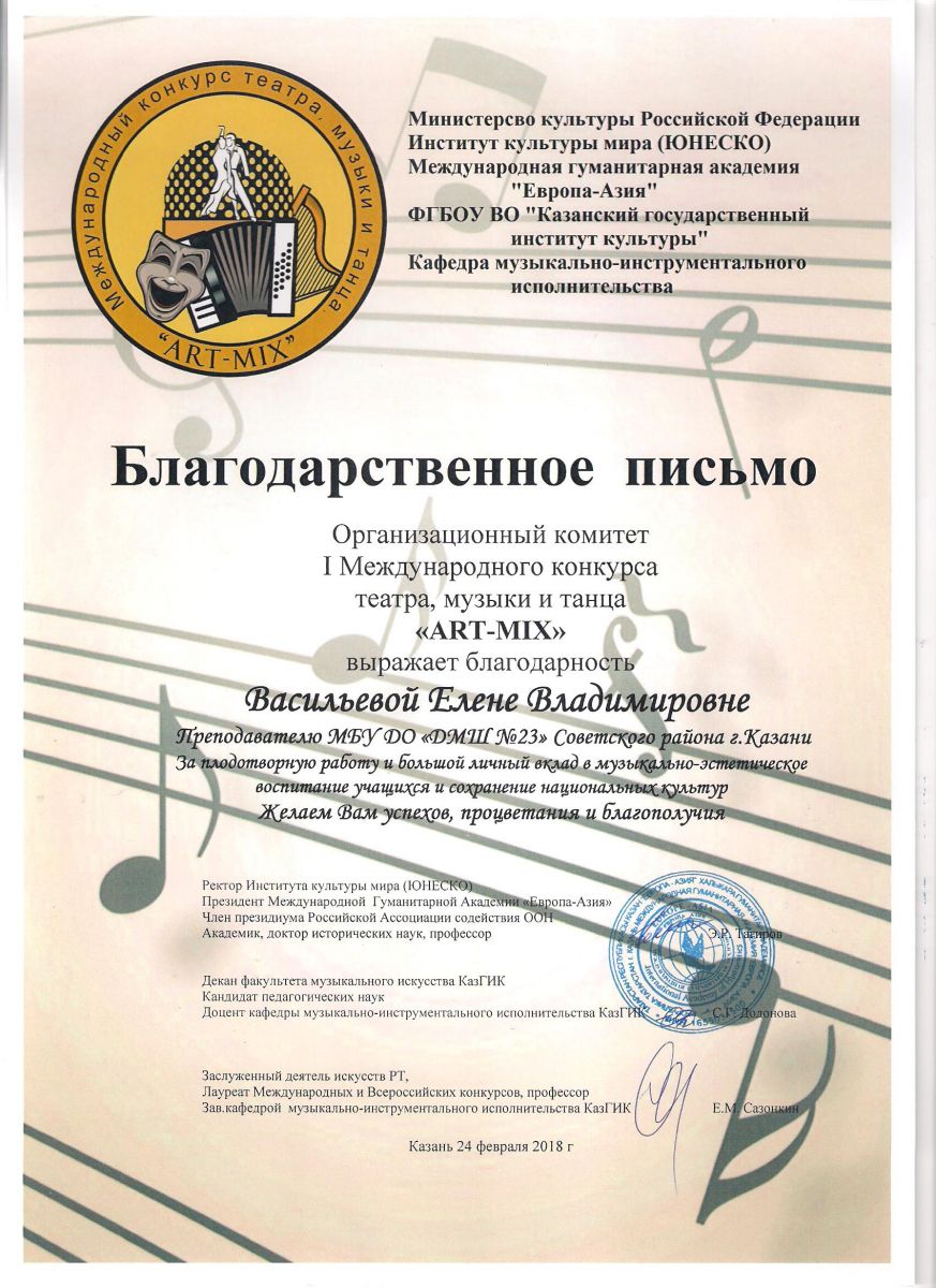 I Международный конкурс театра, музыки и танца "ART-MIX" - Благодарственное письмо - Васильева Е.В.
