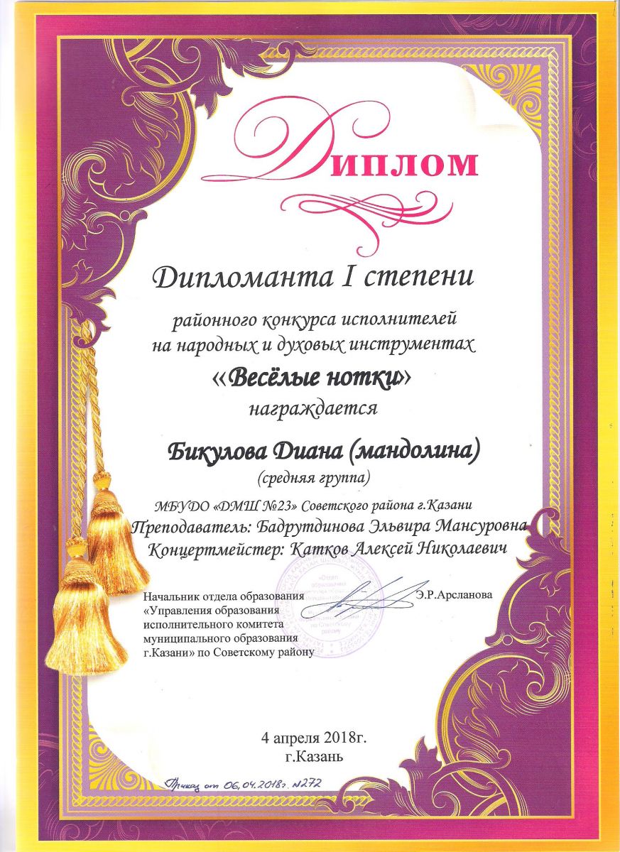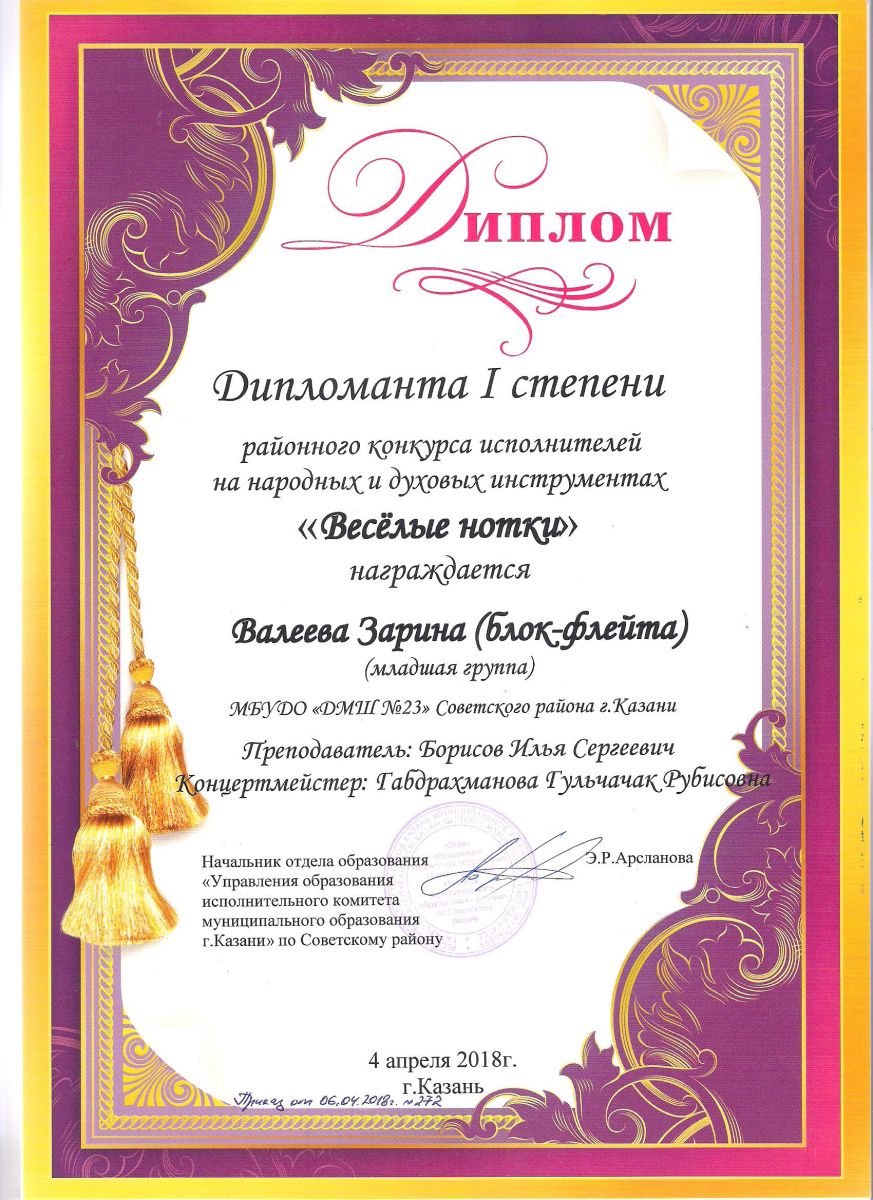 Районный конкурс исполнителей на народных и духовых инструментах "Весёлые нотки" - Диплом дипломанта 1 степени - Сабирзянова Адиля (преподаватель: Петрова М.С., концертмейстер: Петрова М.С.)