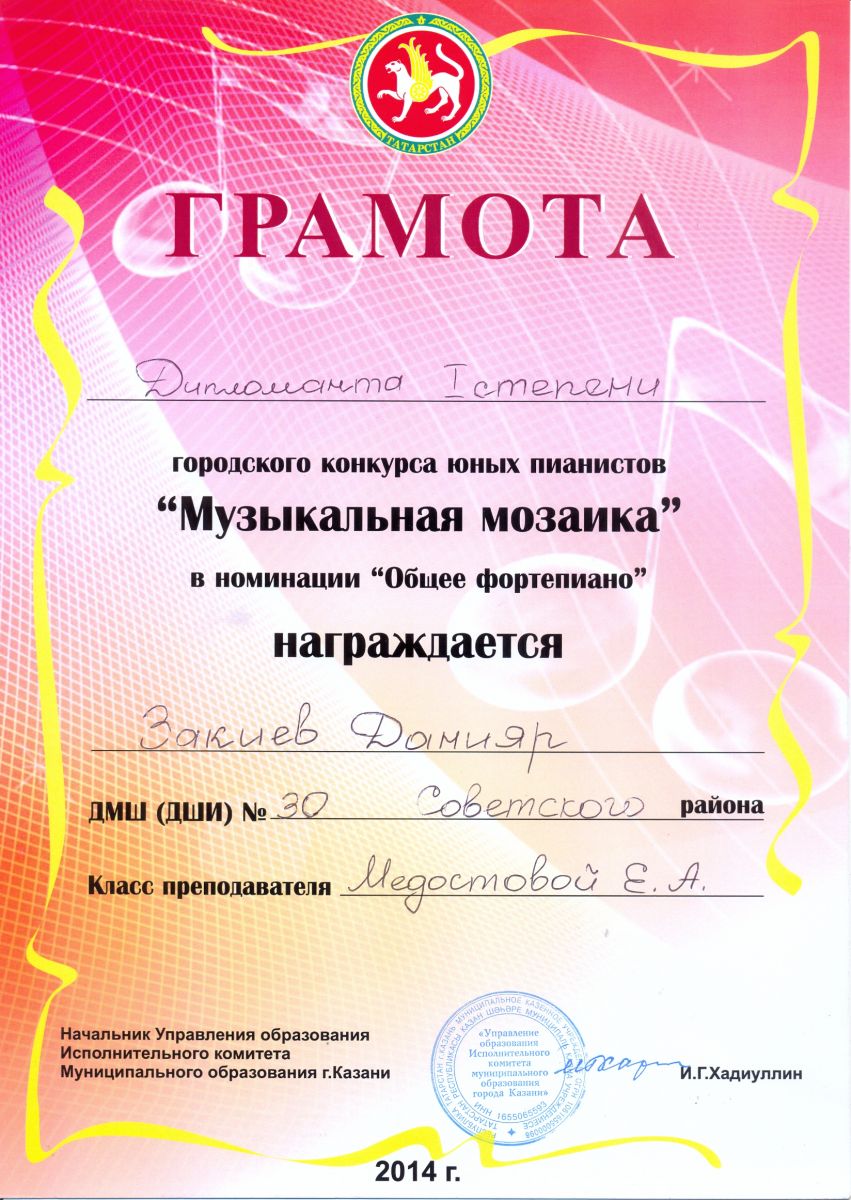 Городской конкурс юных пианистов «Музыкальная мозайка» – Закиев Данияр – диплом I степени