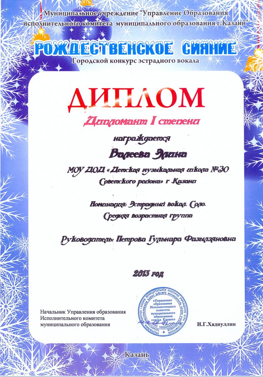 Городской конкурс эстрадного вокала «Рождественское сияние»– Валеева Элина – диплом I степени