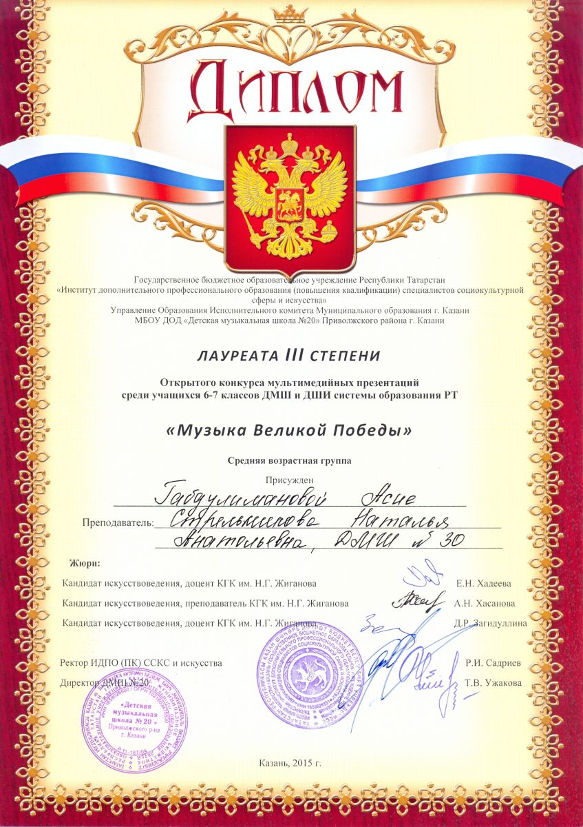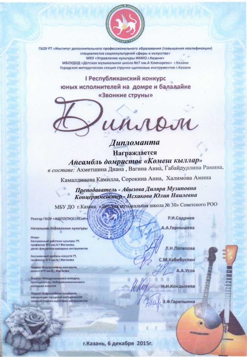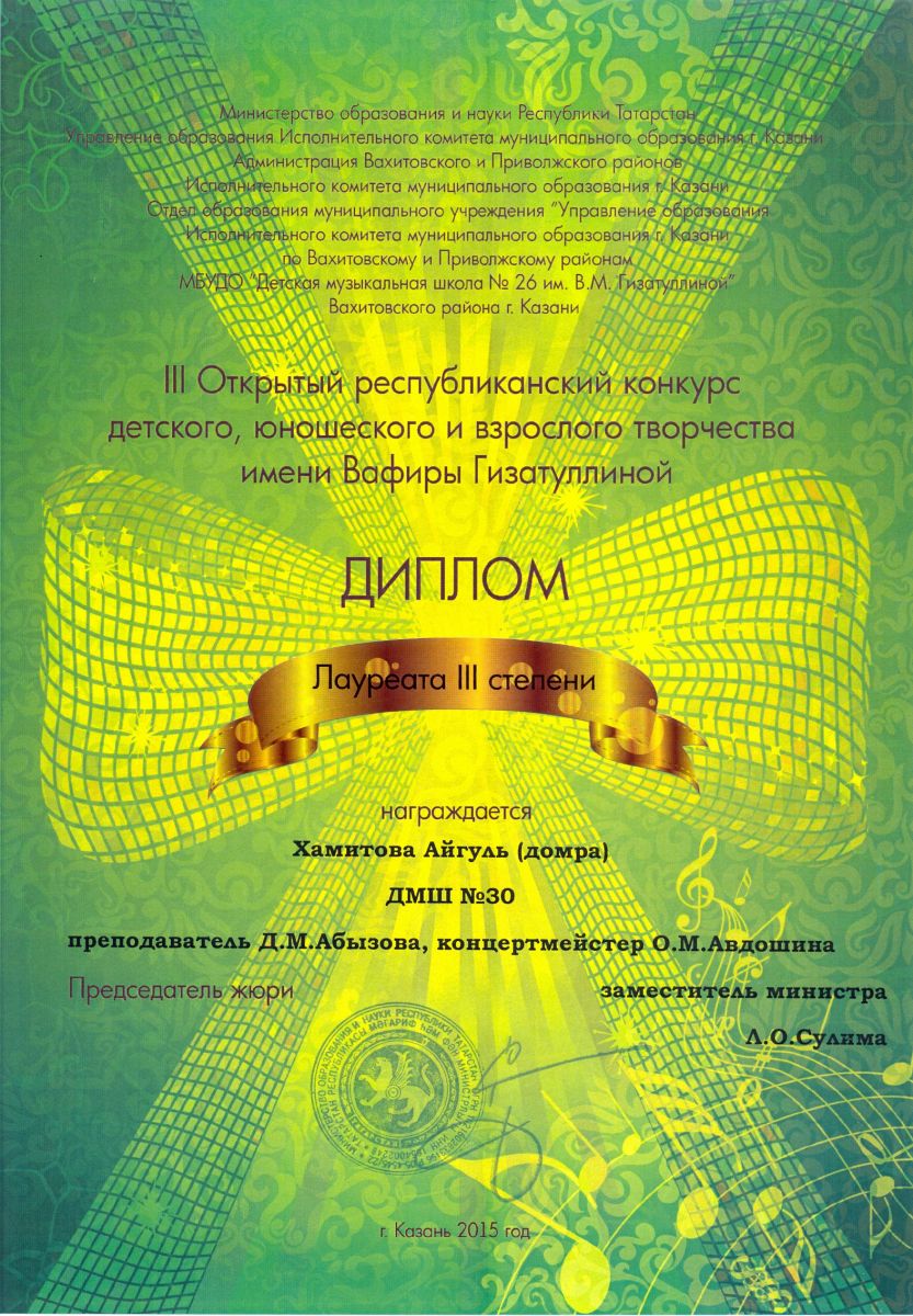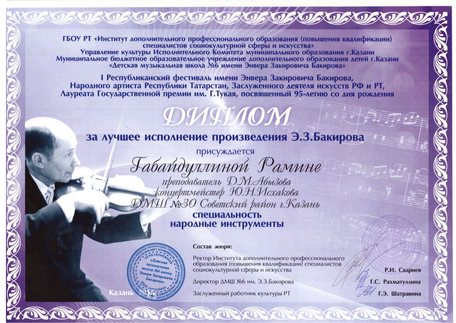 I Республиканский фестиваль им.Э.Бакирова – Габайдуллина Рамина – Диплом I степени
