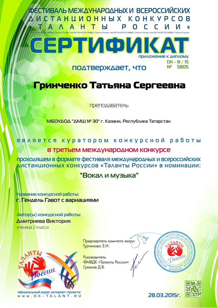 VI Международный конкурс «Таланты России» - Васильева Е.В. - сертификат за подготовку лауреата