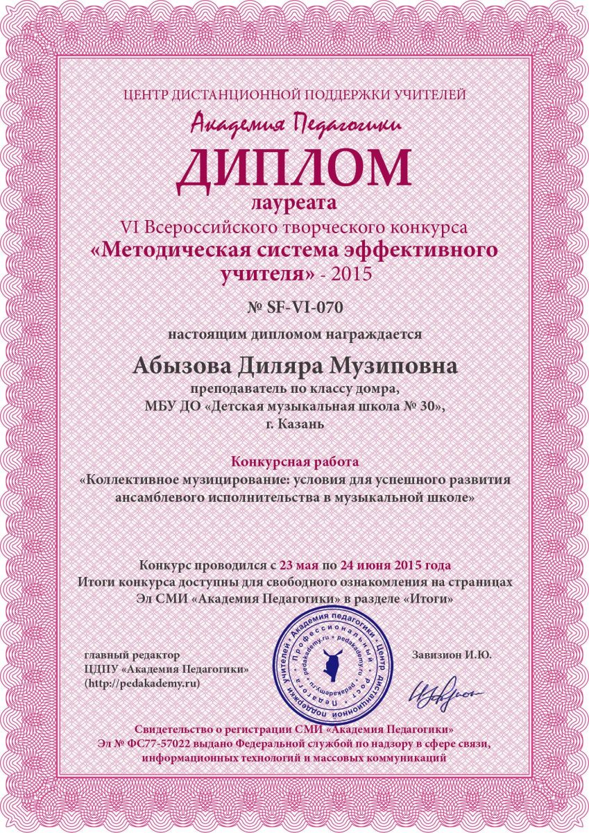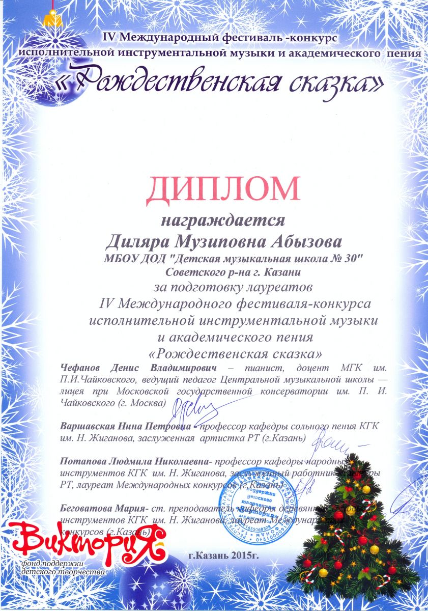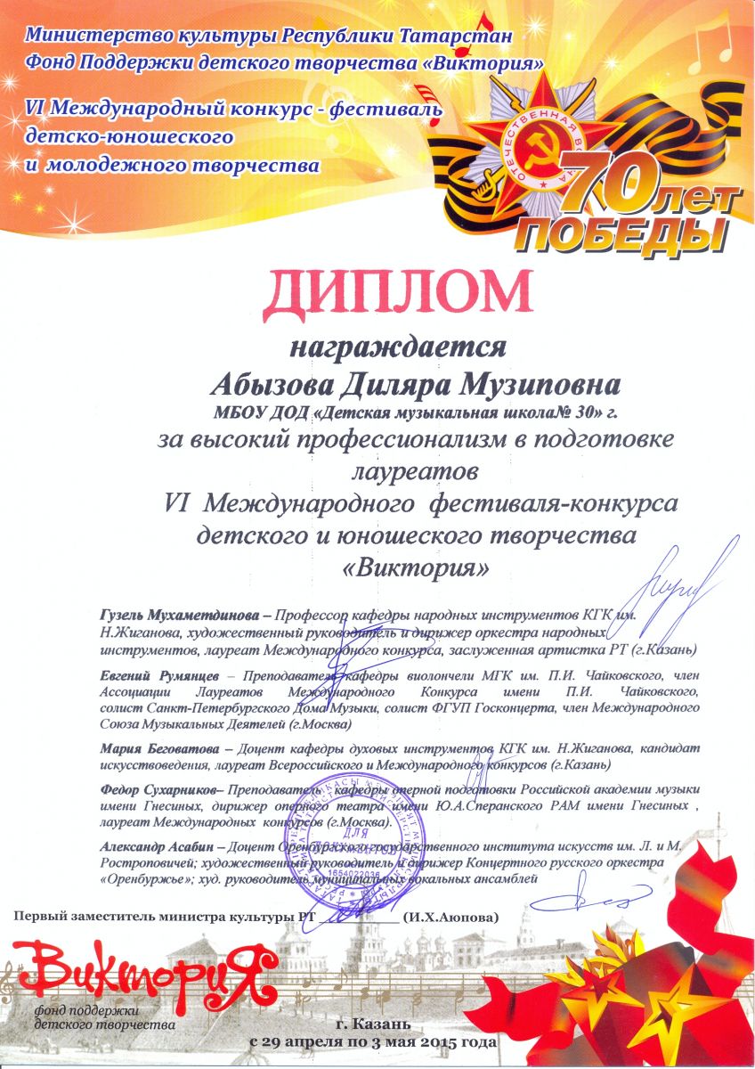 I Республиканский фестиваль им.Э.Бакирова – Абызова Д.М. – Диплом «Лучший преподаватель»