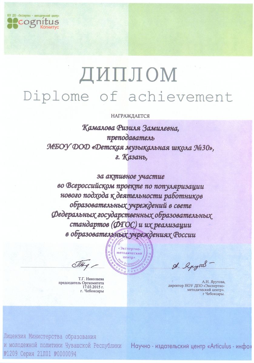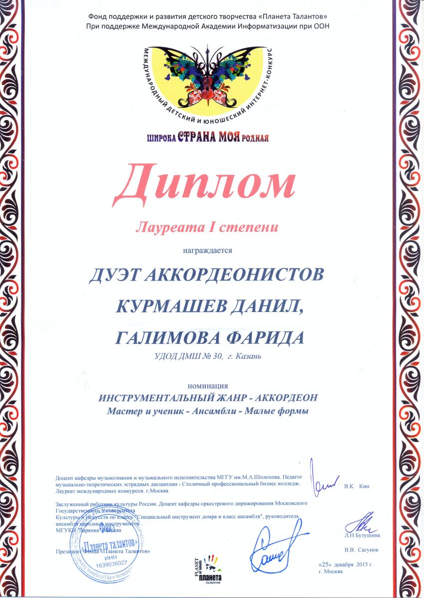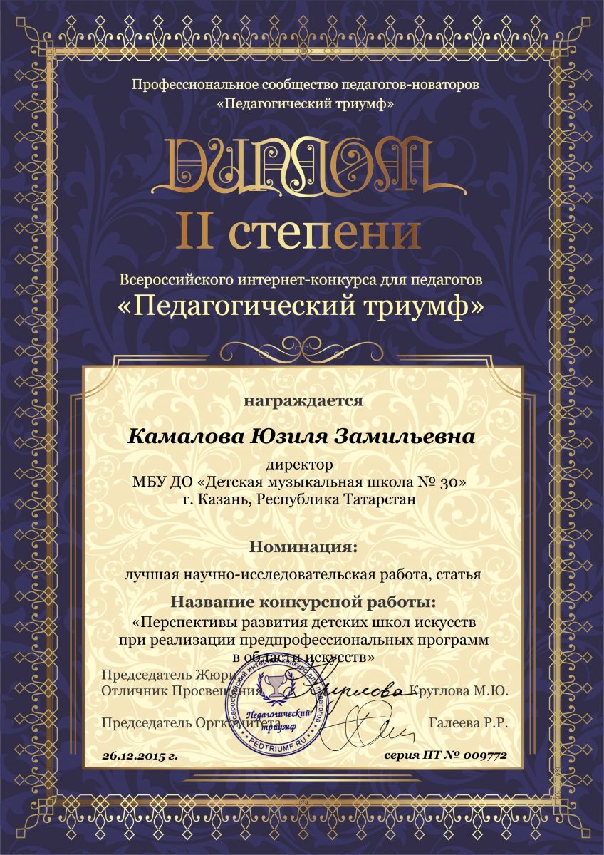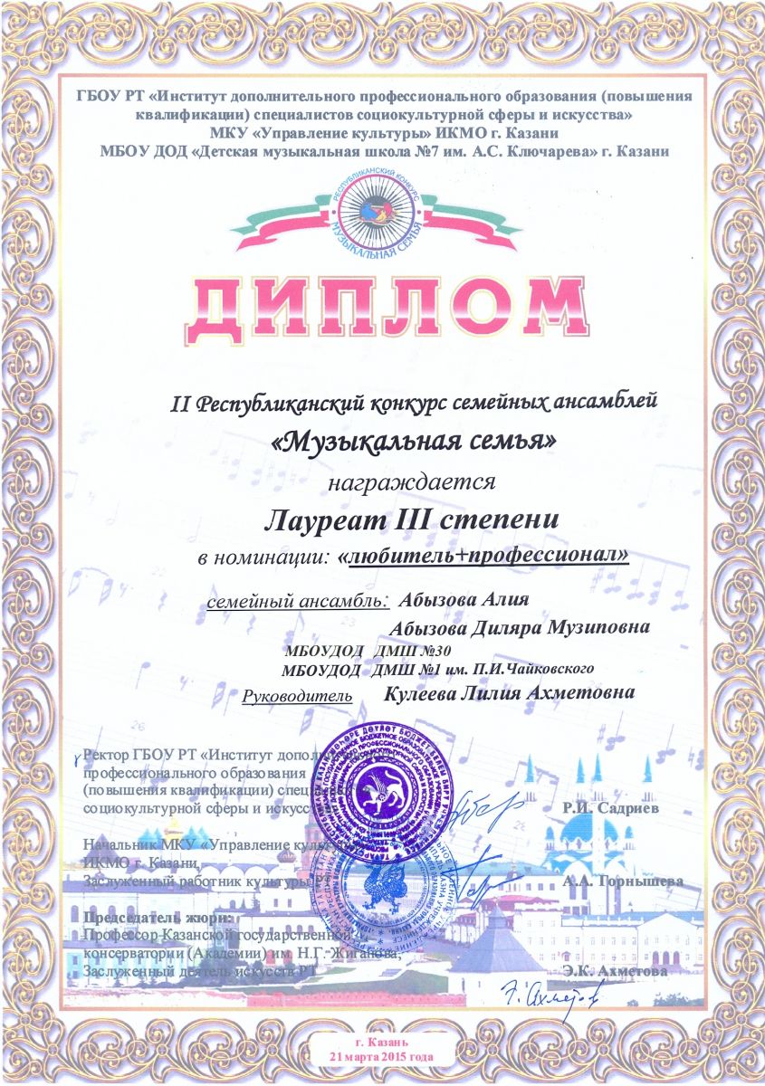 Всероссийская акция «Ночь искусств-2015», фестиваль «В хороводе муз» - Камалова Р.З. – диплом