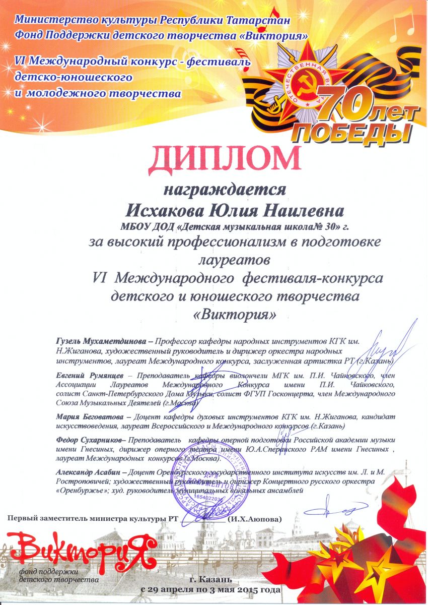 I Республиканский фестиваль им.Э.Бакирова – Исхакова Ю.Н. – Диплом «Лучший концертмейстер»