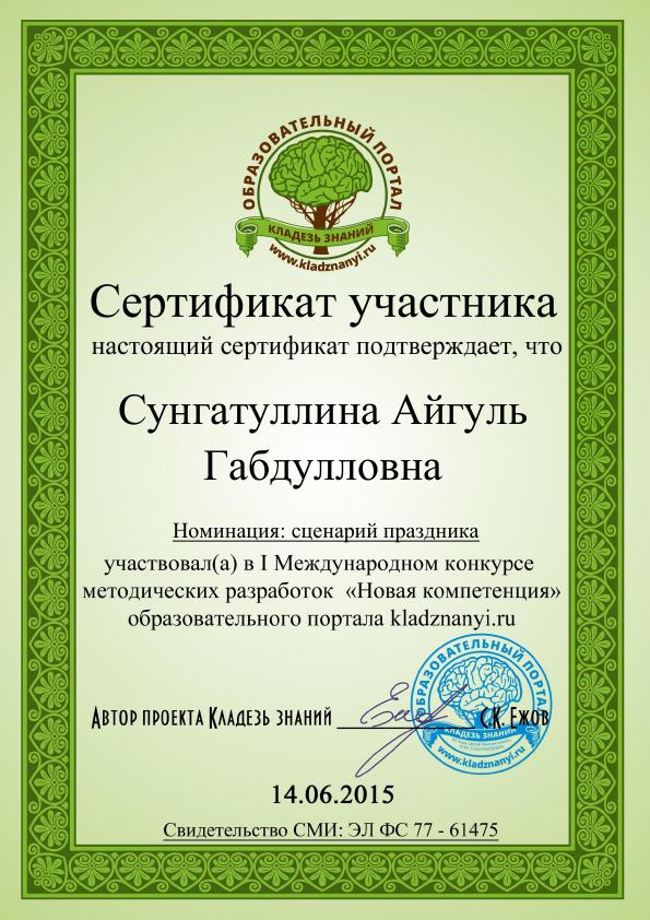 VI Международный конкурс «Таланты России» - Каримова Л.Н. - сертификат за подготовку лауреата