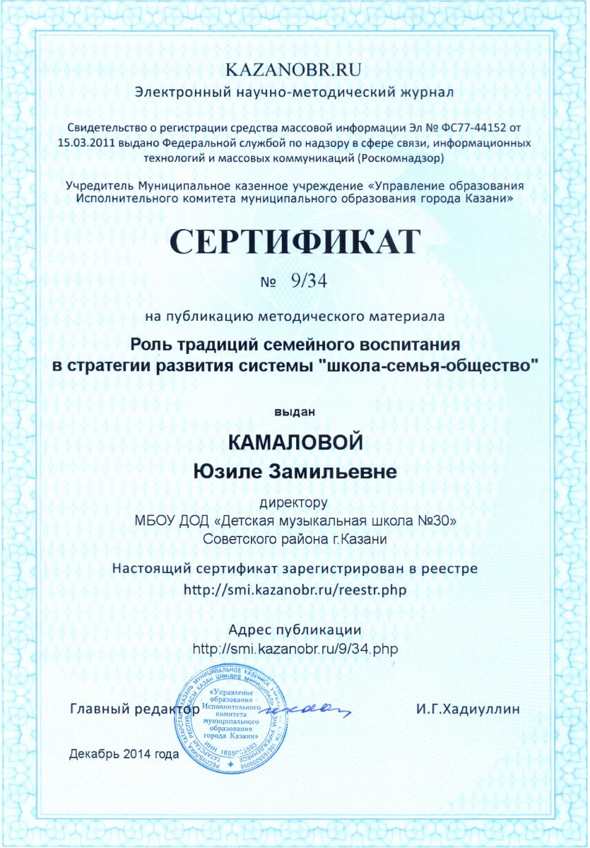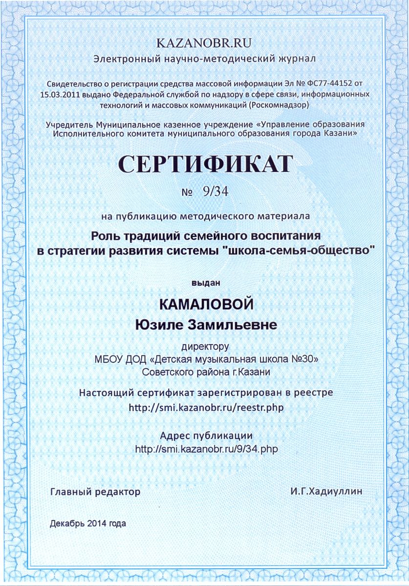 Статья «Роль традиций семейного воспитания в стратегии развития системы «школа-семья-общество» в Электронном научно-методическом журнале KAZANOBR.RU, автор - Камалова Юзиля Замильевна