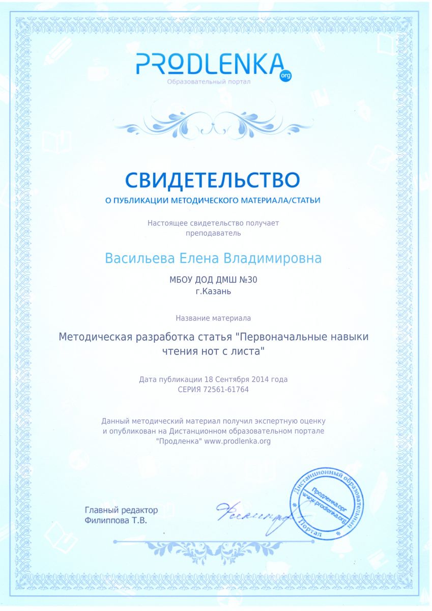 Статья «Первоначальные навыки чтения нот с листа» на Дистанционном образовательном портале «Продленка» www/prpdlenka.org, автор – Васильева Е.В.