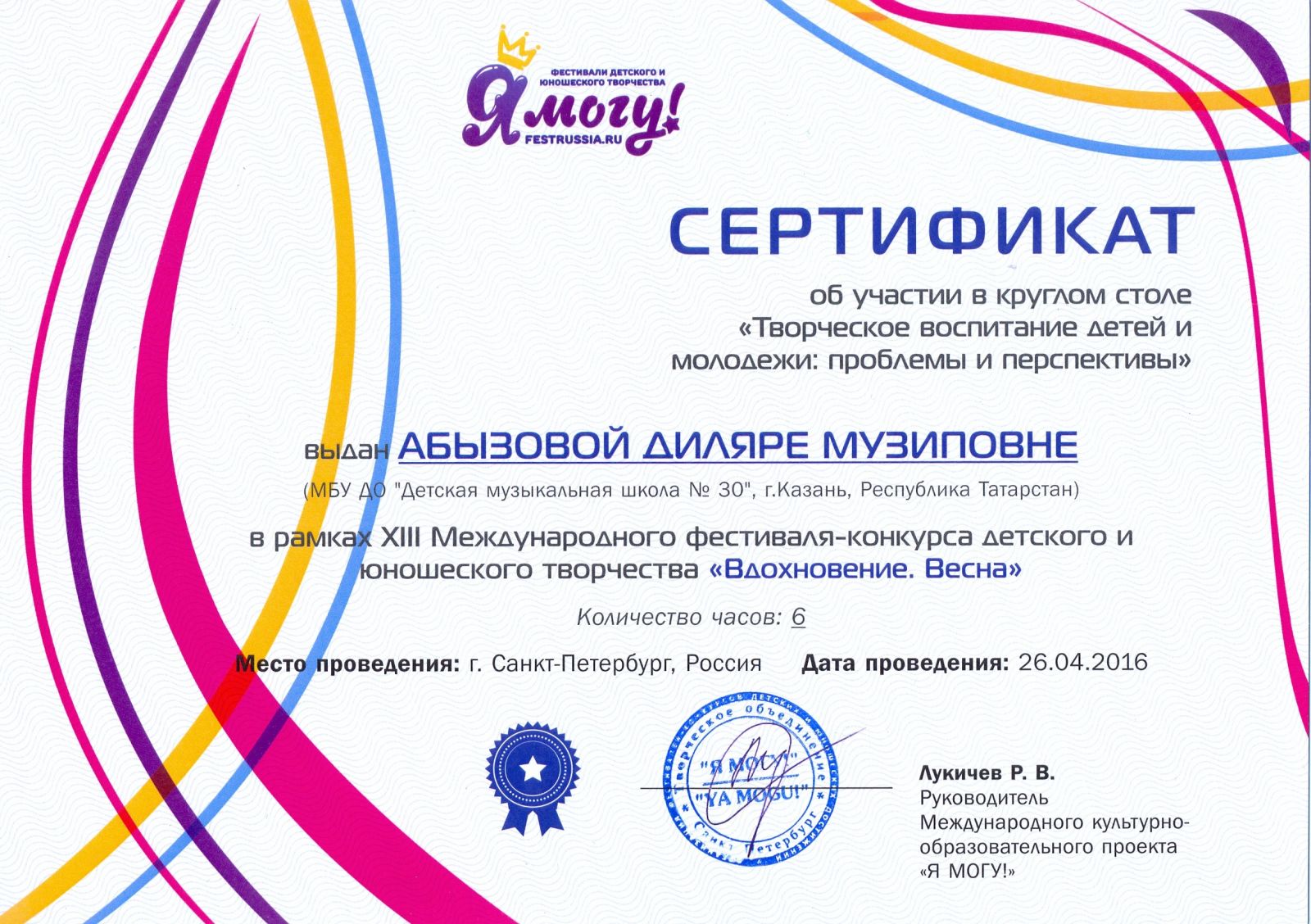 Участие в круглом столе "Творческое воспитание детей и молодежи: проблемы и перспективы" в рамках XIII Международного фестиваля-конкурса детского и юношеского творчества "Вдохновение.Весна" (г.Санкт-Петербург) - Абызова Д.М. - сертификат